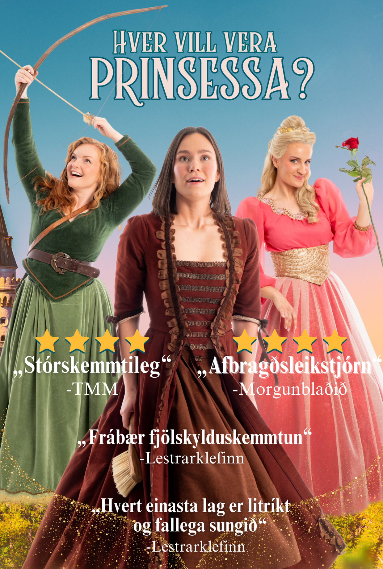 Prinsessur 7, 9 og 13 stíga beint út úr töfraveröld leikhússins og til ykkar – fullar af söng, gleði, og hugrekki! Í þessari líflegu og litríku skemmtun fara prinsessurnar þrjár í spennandi ferðalag þar sem þær læra að standa með sjálfri sér og treysta hver á aðra. Saman geta þær sigrað heiminn og verið þær sjálfar. Með grípandi tónlist, húmor og skemmtilegum prinsessudansi fá þær krakkana til að taka þátt í ævintýrinu með sér!